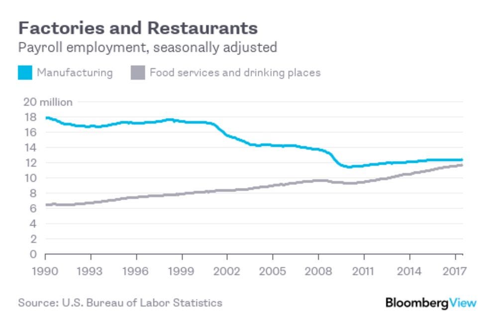 Unemployment hasn’t increased in rich countries during this time, instead, there has been an expansion in both high skilled and low skilled service sector jobs. The result is a “job polarization”, which has seen a decline in wages and employment of “middle skilled occupations” that involve many routine tasks that have been automated.