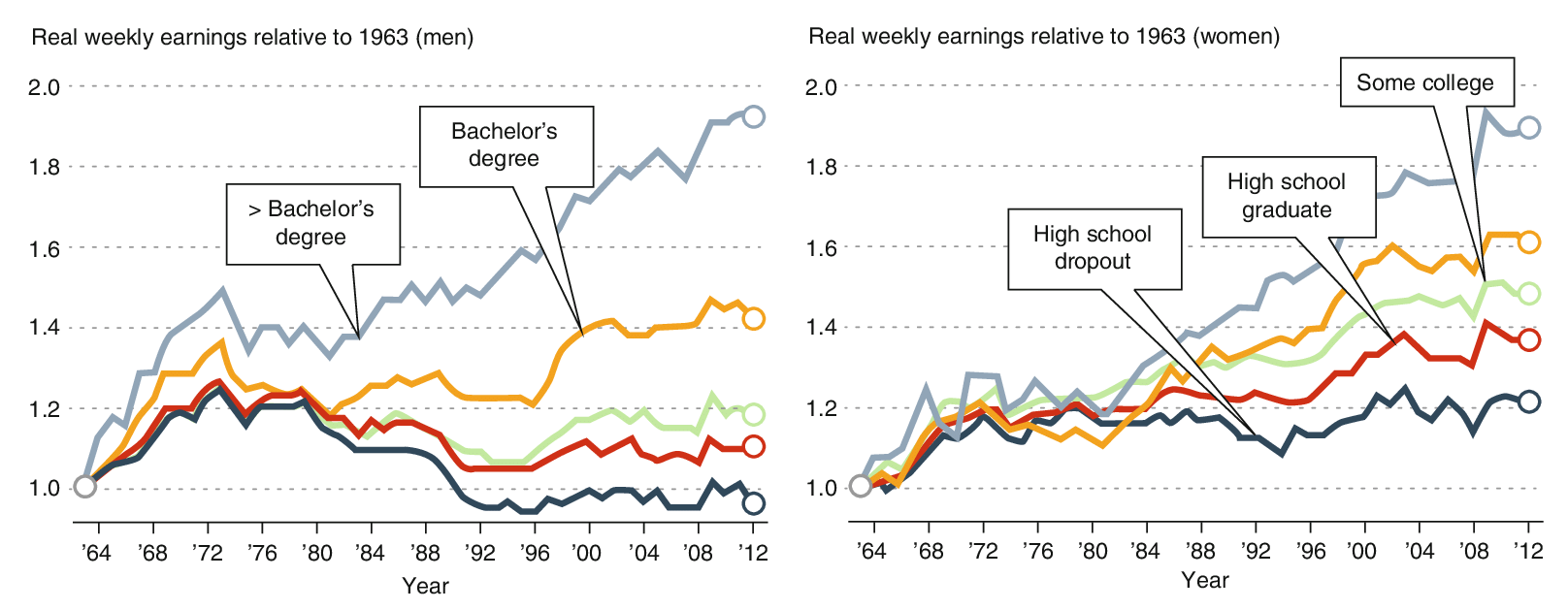 The above graph shows the increasing returns to education in the US, which has led to increased income inequality. US males with bachelor’s degrees have experienced stalled real wages since the early 1970s, while the real wages for those with some university experience and below have declined by a lot. The real wages of graduate degree holders have increased by a lot. For women, things have mostly improved for all education groups, but from a low base. The most obvious explanation for these changes is based on skill-biased technological change.